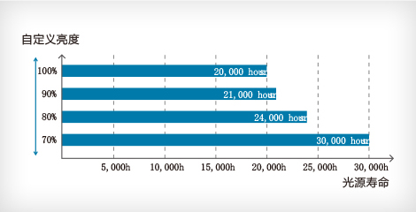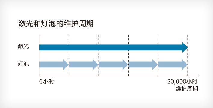 *1 此处维护:仅指光源或防尘网更换。20,000小时为首次使用投影机至光源亮度减少至50%时的近似使用时间。基于在模拟使用环境下(浮沉量0.04-0.20毫克/每立方米)加速测试结果。前述时间非承诺时间,实际时间将受使用模式、环境条件、用户使用习惯等因素影响会有很大差别。
