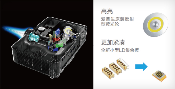 区别于传统的激光二极管发光板,爱普生使用紧凑的激光二极管集合板,在缩小投影机体积的同时输出相同能量,匹配原装反射型荧光轮,有效降低光能损失,实现小巧高亮。